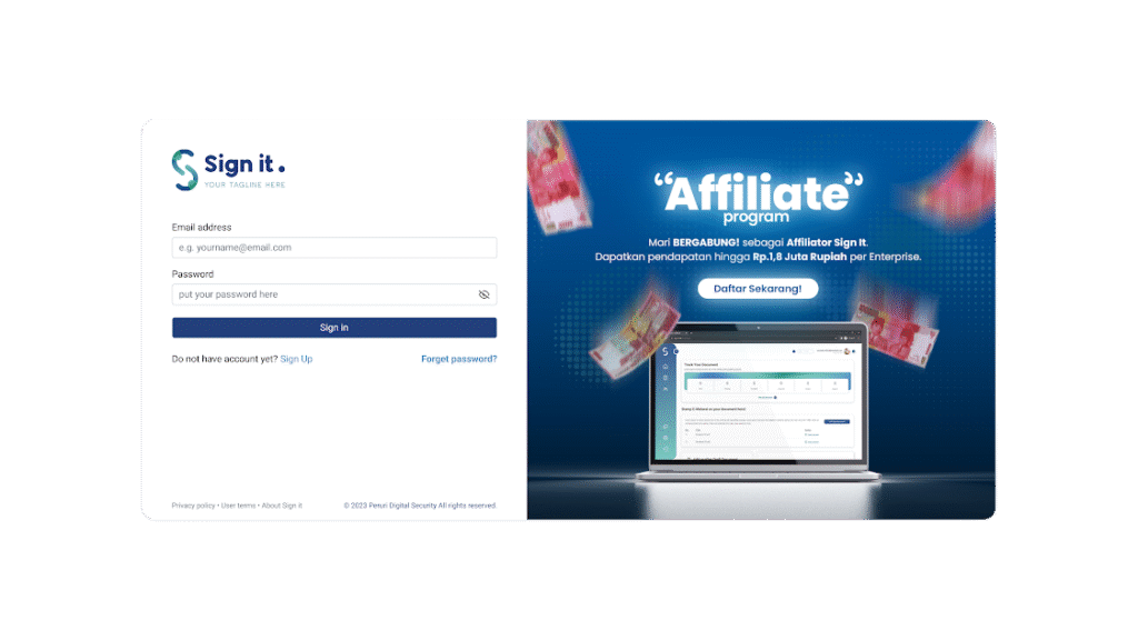 - Setelah verifikasi berhasil, silahkan login menggunakan email dan kata sandi yang sudah didaftarkan. Selamat! Kamu sudah bisa mengakses dashboard aplikasi web Sign It.