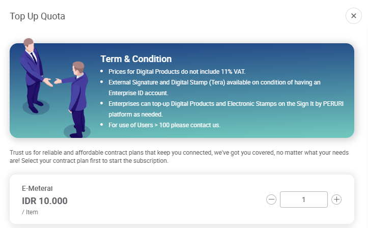 2. Pada pilihan E-Meterai, masukkan jumlah kuota e-meterai yang kamu butuhkan.
