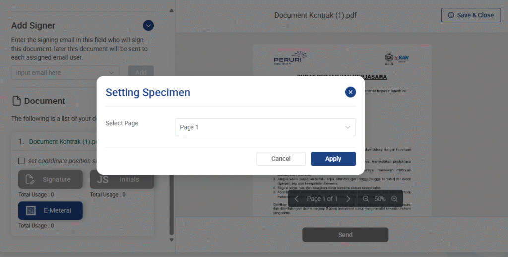 3. Kemudian pilih tombol e-meterai, dan tentukan halaman dokumen yang akan dibubuhi e-meterai, lalu klik “Apply”